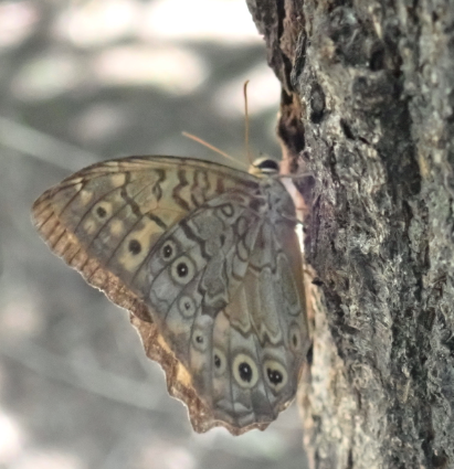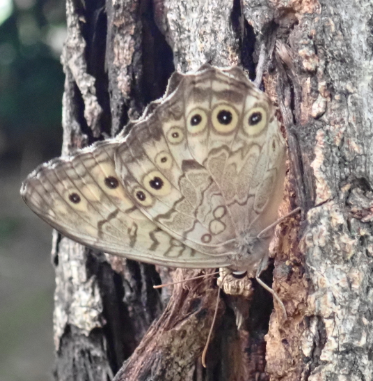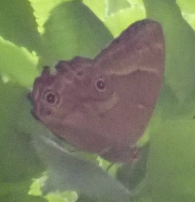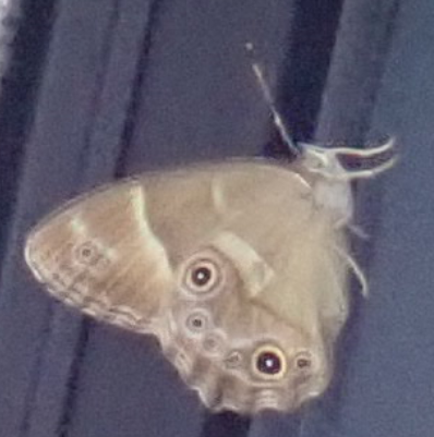 | ウエルシティ公園の狭い林に3個体見つけた。アブラ・ミンミンは迷う。 開発前は彼らの住処だったのかもしれない。 | 帰宅して水遣りしてたら木陰から飛び立ち2Fに行ったので急ぎベランダの戸にいた。 クロヒカゲではなくヒカゲチョウだと思う。 | 田浦の店先に咲いていた。 | |