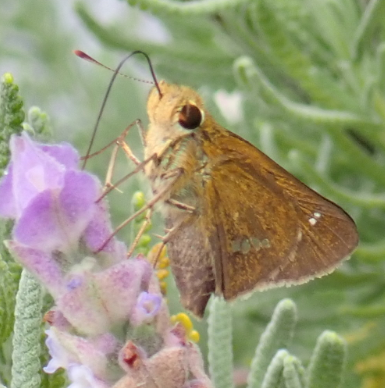 | ウエルシティの草むらにいた。 | 慌ててカメラを向けシャッターを切ったが、この程度の腕。ウエルシティのアガパンサスの茎にいた。 | 朝まだ霧雨の時にウエルシティで台風前の一日分の食事を楽しんでいるようだ。ラベンダーの花。 | |