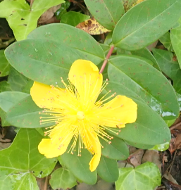 | どぶ板通りの店先に咲いていた。近所にもあるが、ここも名前が書かれた木札がある。 | ウエルシティの脇に咲いていた。 | ウエルシティの脇に咲いていたが、ヒペリカムと思うが園芸種までは同定できない。 | |