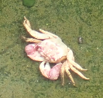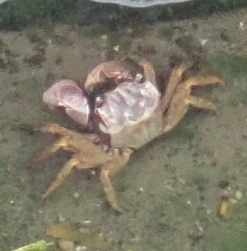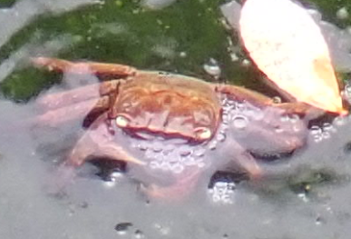 | 市役所前公園で一羽だけ真夏の日差しを浴びていた。冷え性かと思う程悠然と溶けていた。 | 右のカニの上を何匹ものトンボが飛んでいた。ようやく飛翔する姿を撮ることができた。 | バス停の側溝に動かず死んでいた。全く自然体の状態で暑さなのか見当がつかない。 | |
