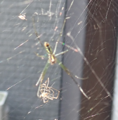 | ようやく吸蜜活動が撮れた。夢中になる瞬間がないと飛翔の予測が難しい蝶だ。 | ようやく卵を産み付けるところを撮った。いつも11時頃と考えた通りだったが、警戒して撮れなかった。 | 隣家と自宅庭をまたいで巣を張り巡らしている。裏から撮った。脱皮した抜け殻が下に見える。 | |