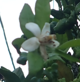 | 20日振りに大物。この間30個くらいの卵を見つけ、10㎜以下の幼虫も10個体は駆除。 | ナツミカンの花にアリがたむろしてアブラムシを送り込んでいる。共存共栄ということか。 | 田浦ガードした横の脇道にいた。黄色というより橙色かな。 | |