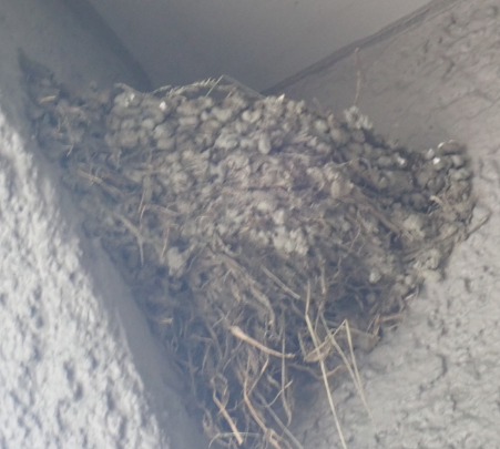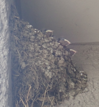 | コクチナシの木に住み着いているが、何を食べているのか。オオスカシバだとしたら頼りない。 | 汀橋バス停脇の民家に隣り合って巣が二つある。こちらはシャッターの中にあり、 家主が好意でブラインドを開けている。下が親と思う。後ろに控えめな1羽がいるが、右は巣立ちそう。 | 池ノ谷戸のバス停脇の溝の石の側溝の上に止まっていた。 | |