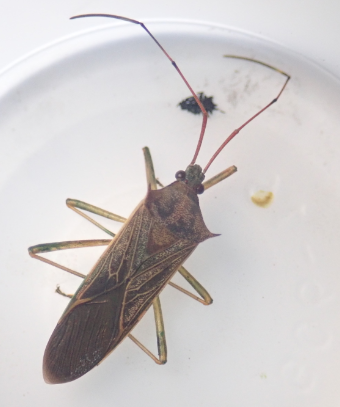 | 以前植えていた芝の名残で採っても生えてくる。負けまいと背が伸びているので別草だ。 | 朝、ベランダから下を見たら、ムクゲの葉に止まり目が合った。暫くして下に降りたので撮った。 | アオバハゴロモが餌食になってしまった。 | |