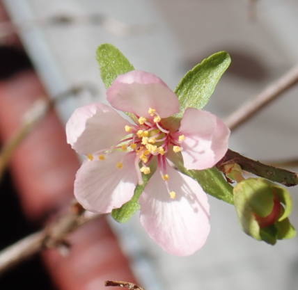 | この時期目立つ。ホームズの花が生活の場になっているし、遊び場でもある。 | 盆栽の小桜と言っているが同定できてない。早春に咲き、赤い実がなるが、実が落ちた今になって一輪だけ咲いた。 | 6丁目の元八百屋の鎧戸にいた。 | |