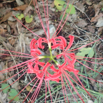 | こちらをグッと睨みつけている。トラという名前はこの眼光をみると頷ける。 | 蘭の根元に巣を作ろうとしている所を捉えて撮った。 | 秋分の日近くになると咲く。八方手を出した千手観音のように思える。 | |